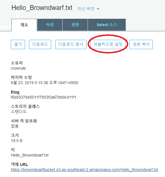 그 후에 다시 Object를 Click 해서 보면, <pic 8>에는 비활성화 되어있던 '퍼블릭으로 설정' 버튼이 <pic 11>에서는 활성화된 것을 알 수 있다. 그리고 이 버튼을 Click하면 URL을 통한 접근이 가능하게 된다.