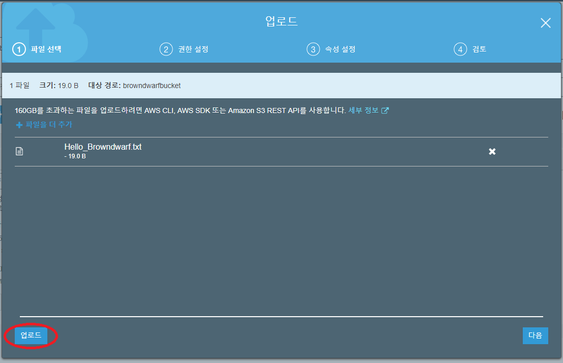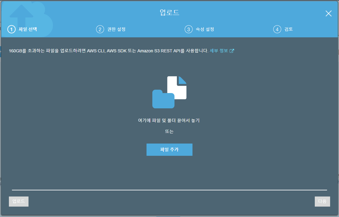 AWS Management Console을 통한 File Upload는 매우 간단하다. (PUT 명령어를 이용하거나 AWS SDK를 이용해서 Upload 할 수 있으나 이 포스팅에서는 언급하지 않겠다.) 위에서 만들어진 Bucket에 들어가면 <pic 4>와 같은 화면이 보이고, 업로드 버튼을 누르면 <pic 5>와 같은 팝업창이 표시된다. 여기에 파일을 Drag-Drop 한 후, <pic 6>에 표시된 '업로드' 버튼을 클릭하면 File이 Upload 된다. (*)