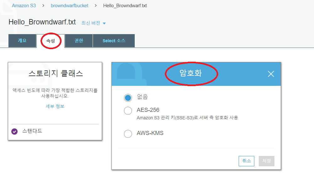 S3에 있는 Object들은 보안을 위해 암호화된 상태로 저장될 수 있다. 개별 Object, 폴더, Bucket 단위로 암호화를 지원한다. 일단 Object를 암호화 하는 방법을 정리하면, Object를 선택한 후에 '속성' > '암호화' 로 진입하면 <pic 17>과 같이 AES-256, AWS-KMS 등의 암호화 방법을 선택할 수 있다. AWS-KMS는 AWS에서 제공하는 Key 관리 서비스로서 암호화할 때 사용하는 Key를 생성/등록/관리할 때 사용하는데, 여기서는 간단하게 Test하기 위해서 AES-256방식을 선택했다. (이 경우 Amazon에서 관리하는 Key(SSE-S3)로 암호화 하게 된다.)