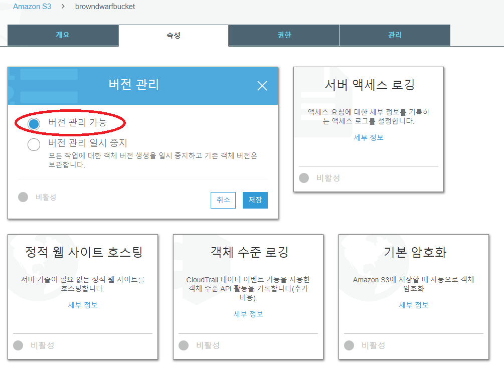 각 Object들은 변경 History를 관리할 수 있다. Bucket에 진입한 후 '속성' > '버전 관리'로 들어간 후 <pic 13>과 같이 '버전 관리 가능'을 설정하면 Bucket에 모든 Object들은 변경 History를 보관하게 된다.