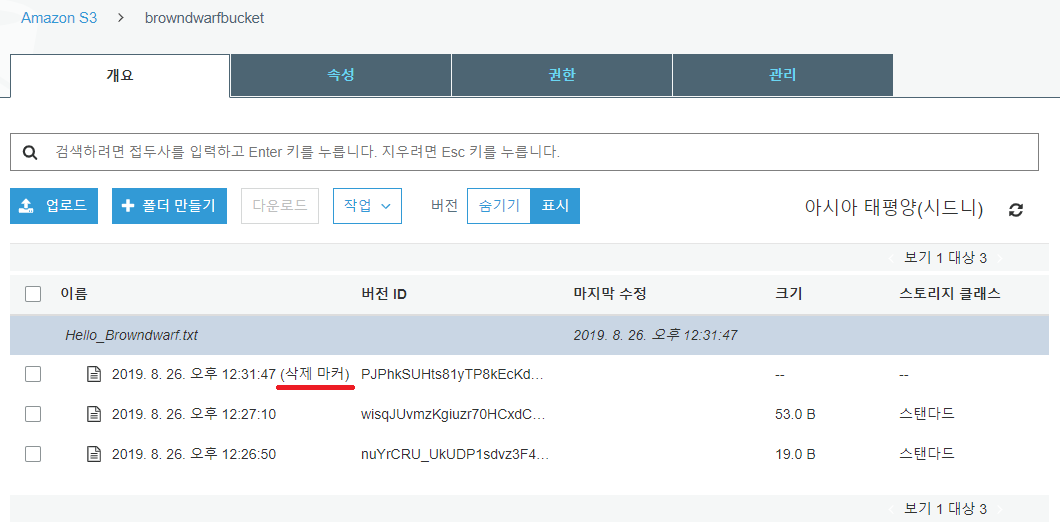 버전 관리는 Object가 삭제 됐을 때에도 유효하게 작동한다. 위에서 언급한 'Hello_Browndwarf.txt'를 삭제한 후에 버전을 표시하면 <pic 16>와 같이 '(삭제 마커)' 라고 삭제된 Object임을 나타내면서 표기하게 된다.