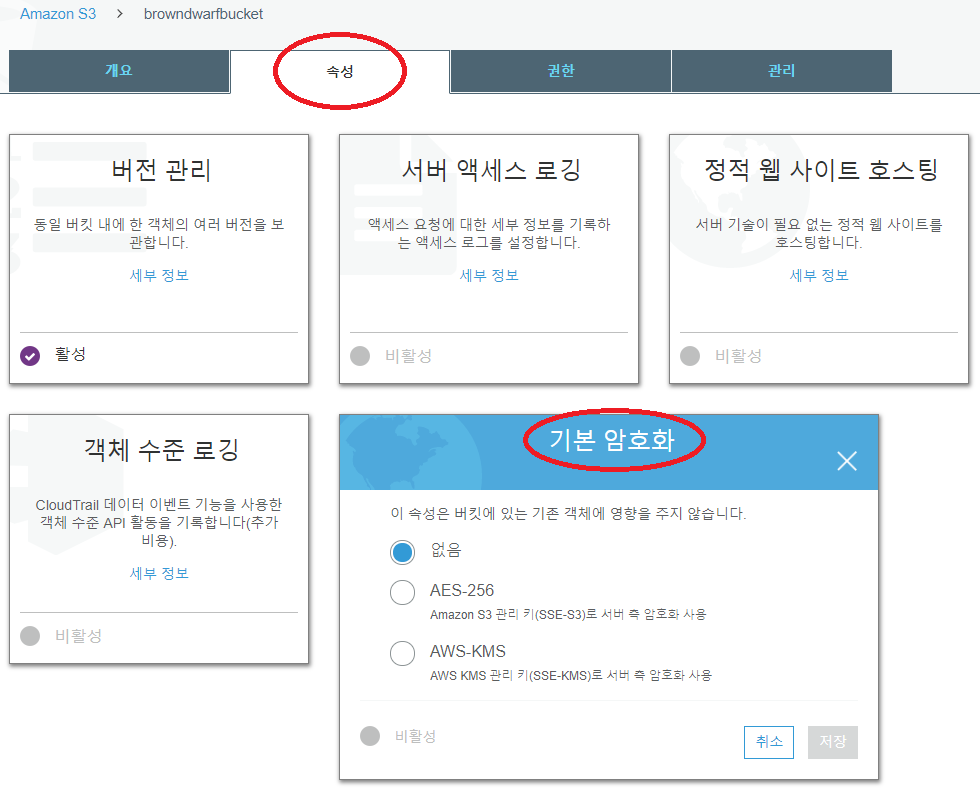 그리고 또 Bucket 전체에 암호화를 설정할 수도 있다. <Pic 23>과 같이 Bucket에 진입한 직후에 '속성' > '암호화'를 선택하면 Bucket을 암호화할 수 있다.