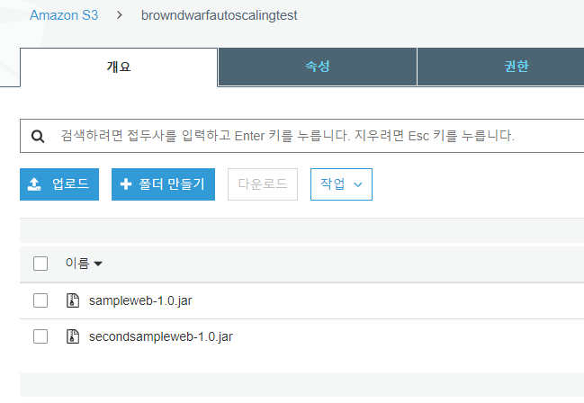 EC2 Instance에서 이 프로젝트를 실행할 수 있게 gradle을 이용해 build 한 후에 생성된 jar file들을 여러 EC2 Instance에서 쉽게 가져갈 수 있게 AWS Console을 통해 S3에 Upload 하였다(<pic 1> 참조). 여기서 사용된 S3 버킷은 'browndwarfautoscalingtest'이라는 이름으로 새로 생성했으며, 나머지 설정은 기본값 그대로 두었다.