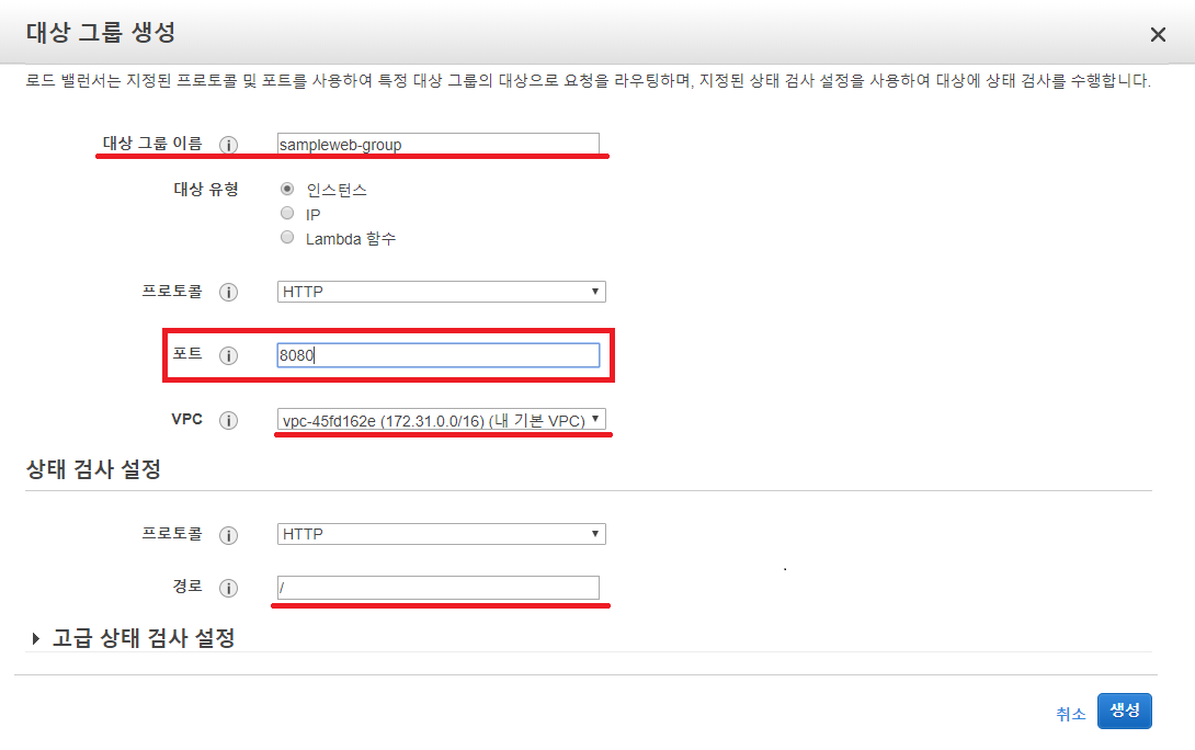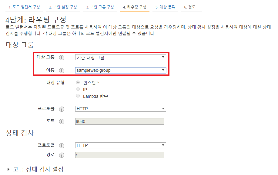 - 이름 : sampleweb-group(Target Group을 가르키는 이름)