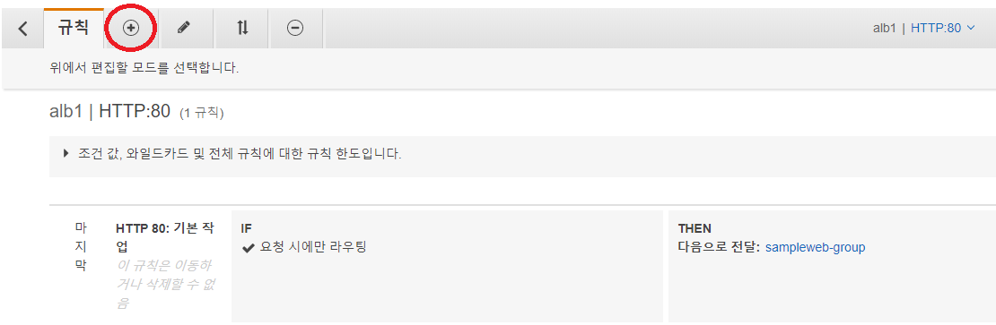Routing 규칙을 추가하려면 <pic 25>의 하단에 있는 여러 Tab 중에서 '리스너' tab을 연다. 리스너 Tab은 <pic 26>과 같으며 현재는 80 로 접근하는 Request가 sampleweb-group으로 Routing 되는 것을 확인할 수 있다. 그리고 그 아래에서 '규칙 보기/편집'을 클릭해서 규칙을 추가할 수 있다.
