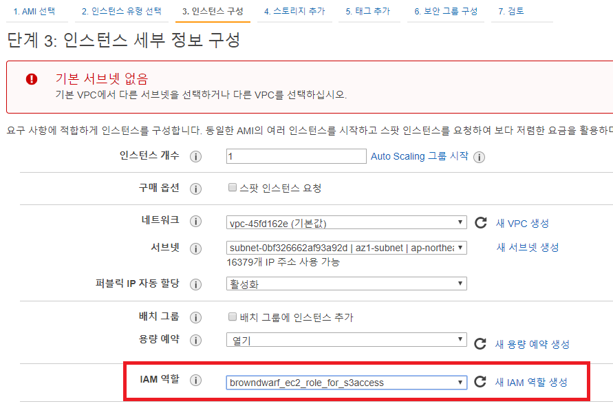 이 설정은 EC2 Instance를 만드는 과정에서 바로 적용할 수 있다. EC2 Insance 생성 과정 중 <pic 6>과 같은 '인스턴스 구성' 단계에서 중간에 위치한 IAM 역할 Combo box에서 IAM Role을 선택하면 된다.