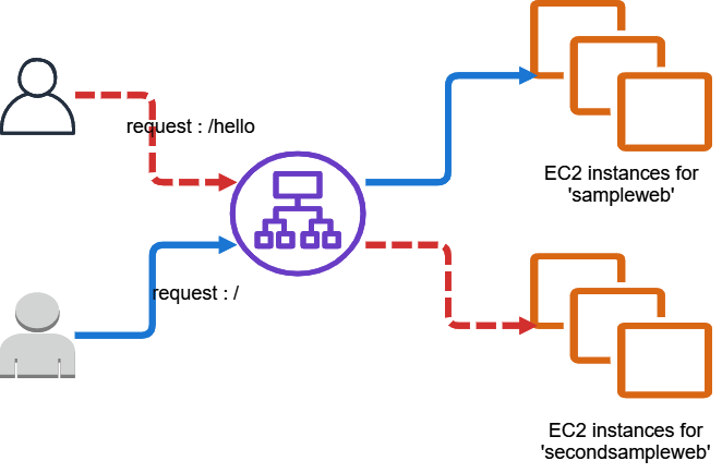- AWS Application Load Balancer를 생성 후 root path로 접속 시에는 sampleweb으로 연결, '/hello' path로 접속 시에 secondsampleweb으로 연결