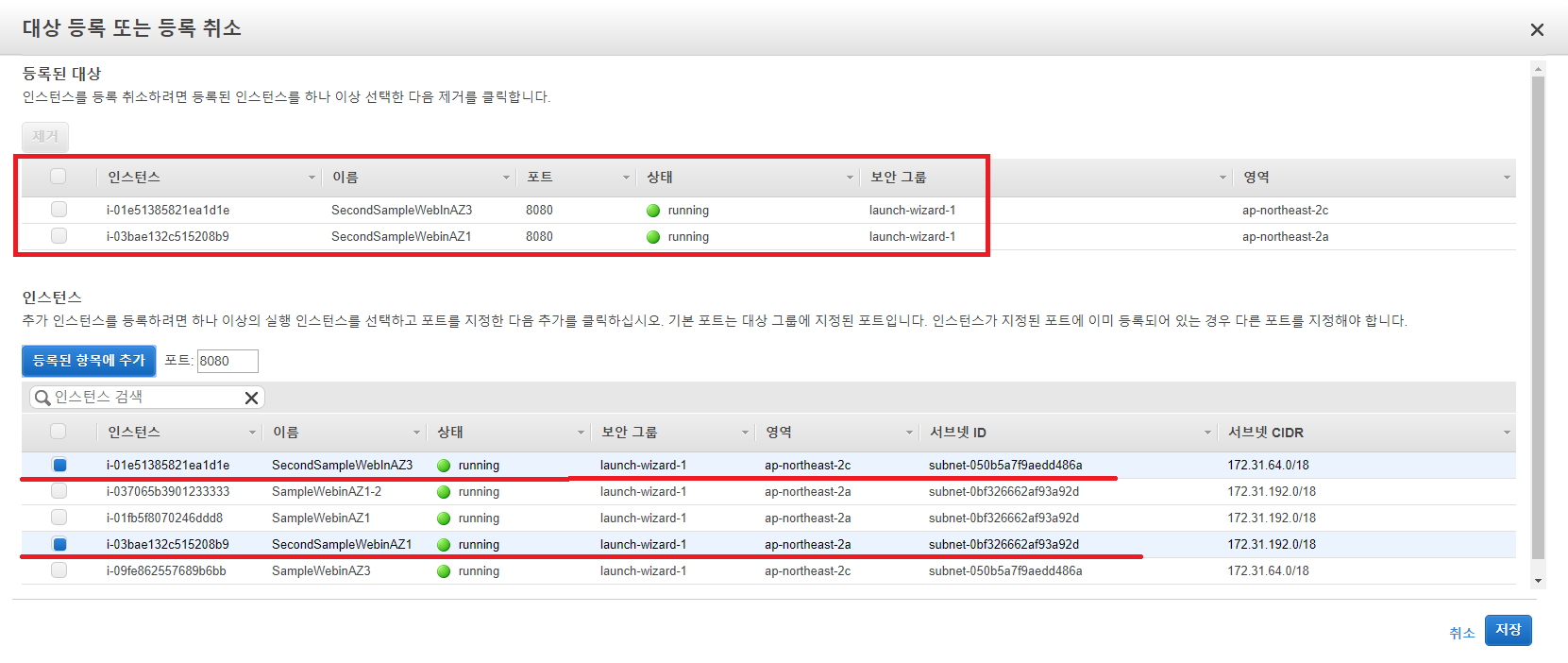 <pic 16>에서 제일 하단의 EC2 Instance List에서 SampleWebInAZ1, SampleWebInAZ1-2, SampleWebInAZ3 등 3개를 선택해 '등록된 항목에 추가' 버튼을 누르면 Target Group에 EC2 Instance들이 포함되게 된다.