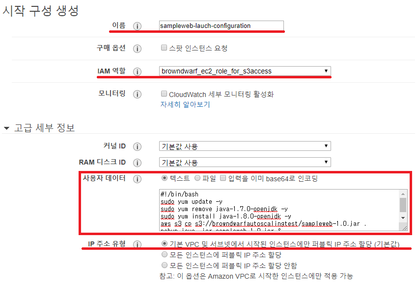 AMI와 Instance Type을 선택하면 <pic 3>과 같이 시작 구성(Luanch Configuration)을 생성해야 한다. 이름 외에 S3에 접근할 수 있는 IAM Role을 설정해 줄 필요가 있어 이전 포스팅에서 만들었던 browndwarf_ec2_role_for_s3access를 사용하였고, Instance 시작시 기본 구성을 위해 이전과 동일한 Script를 사용자 데이터에 입력했다. <pic 3>에 빨간색으로 가르킨 부분 중 가장 아래부분은 자동으로 생성되는 EC2 Instance들이 Public IP를 보유하는 지 여부를 설정하는 부분인데 Debugging을 위해 SSH 접속할 수 있는 Public IP를 가질 수 있게 설정하였다.