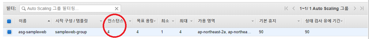 위의 Script를 실행한 후 약 5분 뒤 Auto Scaling Group을 확인하면 <pic 8>에서 1개의 Instance가 <pic 10>에서는 인스턴스의 최대치였던 4개까지 증가되어 있음을 확인할 수 있다. (참고로 하단 Tab들 중에서 '활동 기록' Tab을 확인하면 초기 생성부터 Scaling작업으로 Instance가 늘어나는 시간들을 확인할 수 있다.)