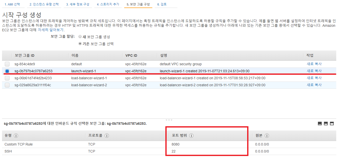4단계에서는 <pic 4>와 같이 보안 그룹(Security Group)을 설정하는 단계인데, 이전 포스팅과 동일하게 22, 8080 port를 통한 접속을 허용하게 설정하였다.
