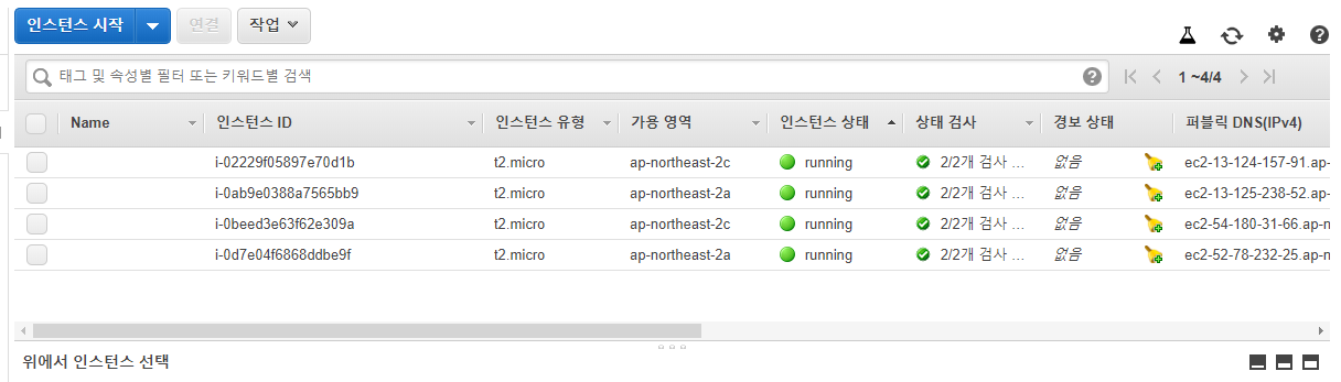 위의 내용은 EC2 > '인스턴스'에서도 확인할 수 있다. <pic 11>과 같이 늘어난 4개의 Instance들을 확인할 수 있다.