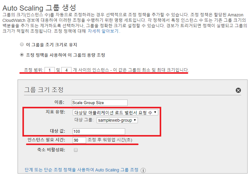<pic 6> 설정이 끝나면 <pic 7>과 같이 Scaling 수행 조건을 설정하게 된다. 이 예에서는 Instance가 1~4개 사이에서 증감이 되게 설정하였고, Instance를 추가할 때의 조건은 로드 밸런스를 통해 전달되는 Request의 수가 100이면 Scale Out이 되도록 설정했다. 지표 유형(Metric Type)과 대상값(Target Value)으로는 '대상당 애플리케이션 로드 밸런서 요청 수'외에 '평균 CPU 사용률', '평균 네트워크 입력', '평균 네트워크 출력' 등이 있으며 Scaling할 Application의 특성에 맞게 정해야 한다.