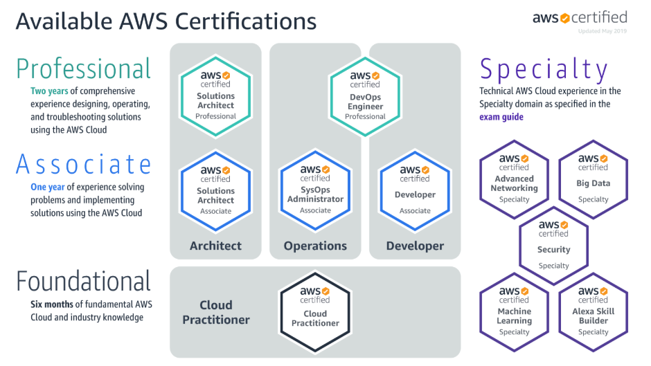 AWS 자격증은 <Pic 1>과 같이 AWS Site에서 안내되고 있었고 필자의 기술 Stack을 고려하면 AWS Certified Developer Associate부터 시도하는게 맞기는 했지만, AWS 서비스 전반적인 지식이 필요한 것 같고, Solutions Architect를 지원하는 사람들이 더 많아 관련 자료를 좀 더 구할 수 있을 것 같아서 Solutions Architect Associate 를 목표로 하게 되었다.
